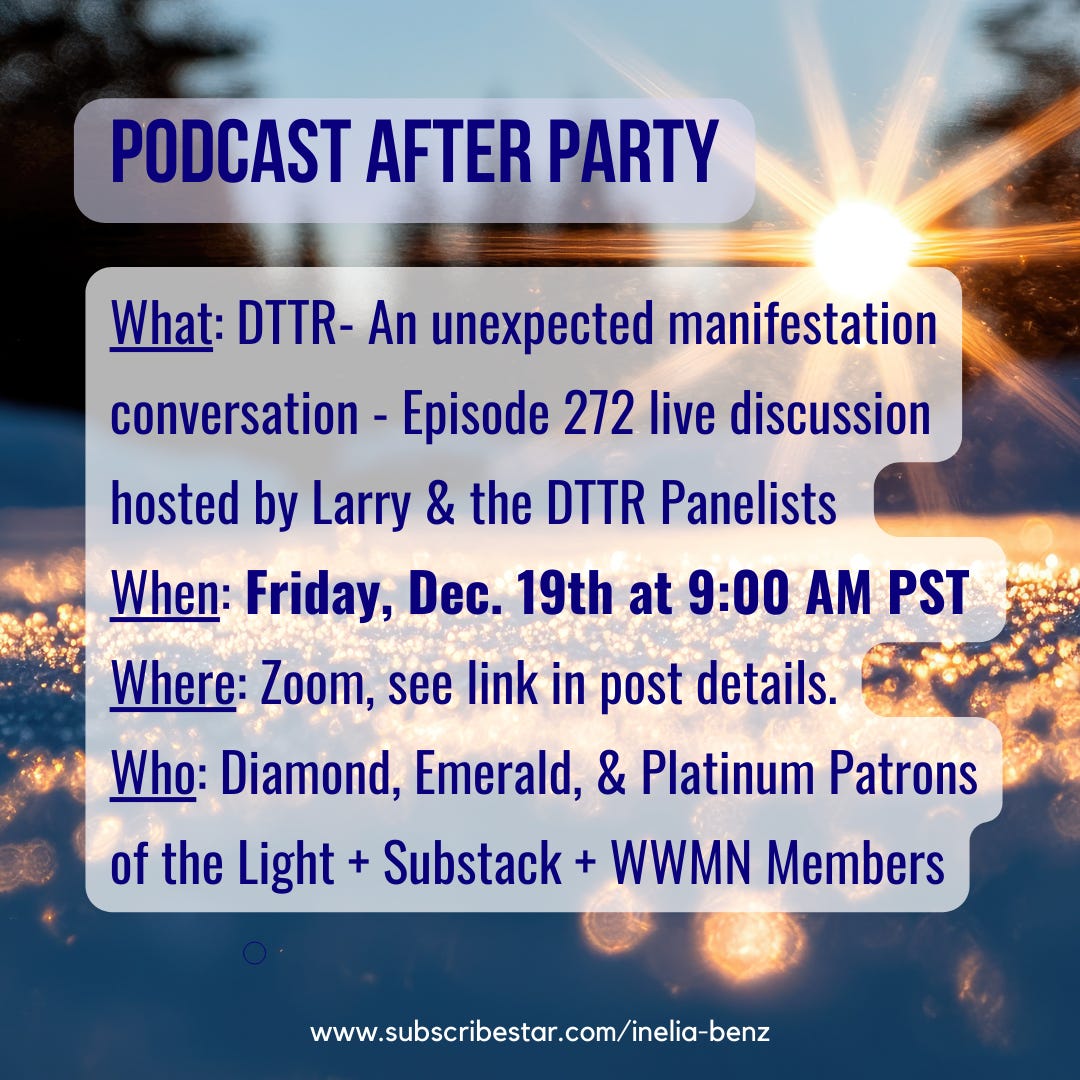 Our next After Party for DTTR this Friday at 9am Pacific. The After Party is available to StartTribe members with the Diamond, Emerald, & Platinum Patron of the Light subscriptions, 2nd Hour Subscribers, and WalkWithMeNow members.