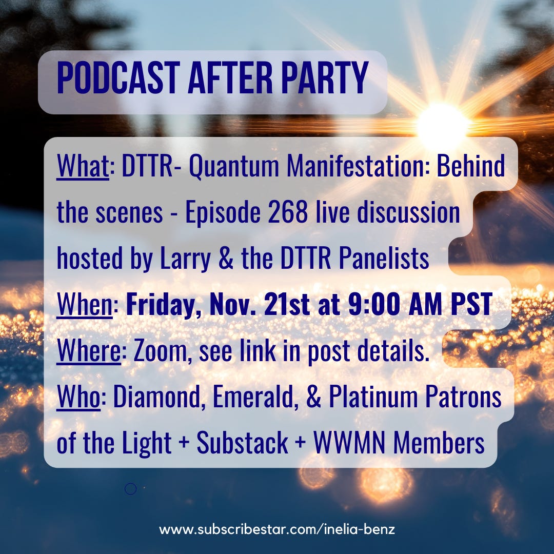 Our next After Party for DTTR this Friday at 9am Pacific. The After Party is available to StartTribe members with the Diamond, Emerald, & Platinum Patron of the Light subscriptions, 2nd Hour Subscribers, and WalkWithMeNow members.
