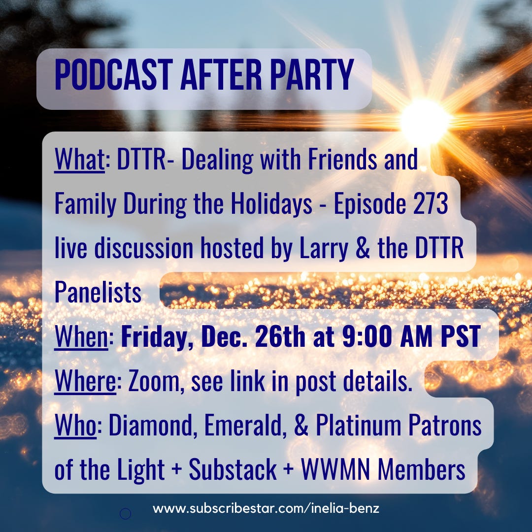 Our next After Party for DTTR this Friday at 9am Pacific. The After Party is available to StartTribe members with the Diamond, Emerald, & Platinum Patron of the Light subscriptions, 2nd Hour Subscribers, and WalkWithMeNow members.