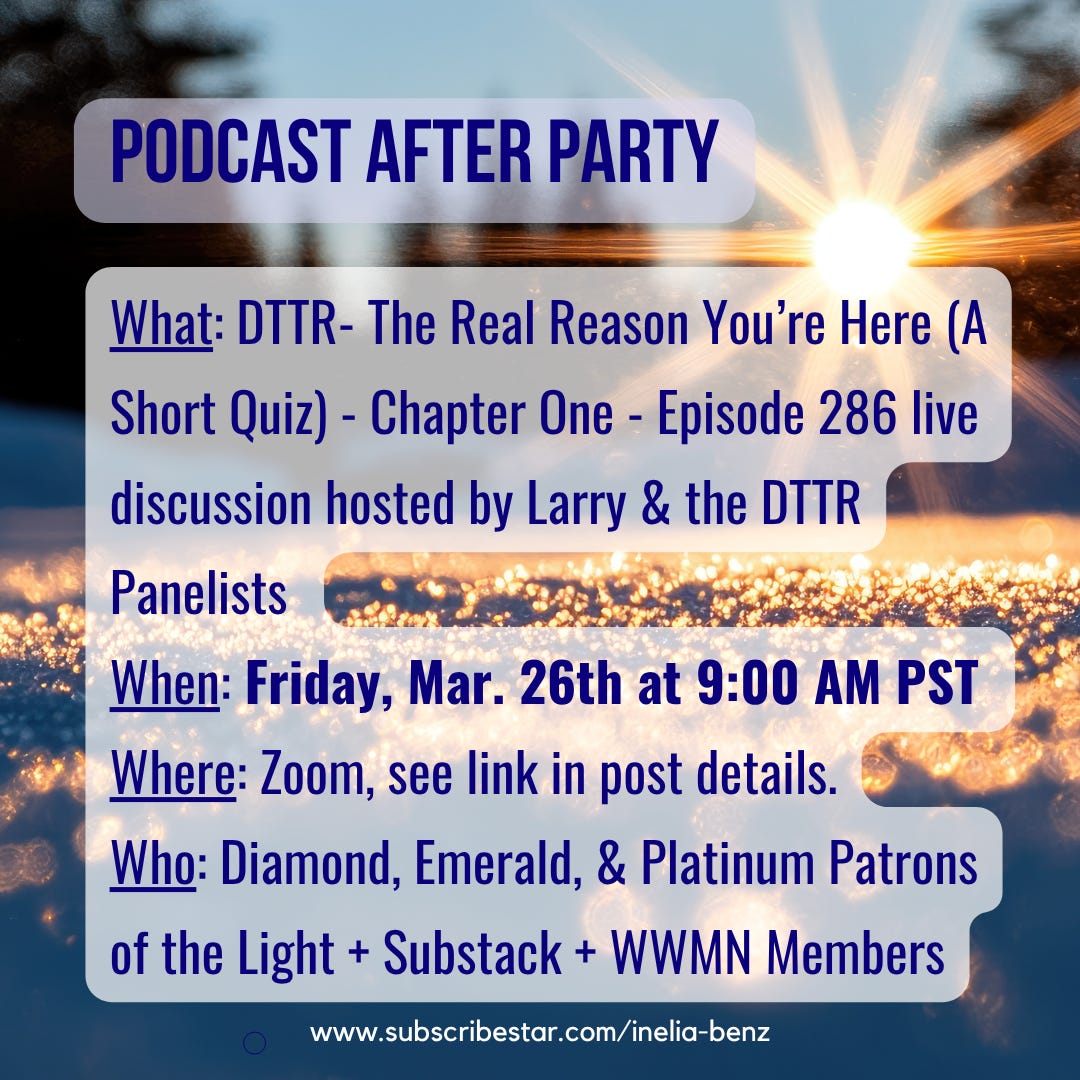 Our next After Party for DTTR this Friday at 9am Pacific. The After Party is available to StartTribe Patron of the Light subscription holders, 2nd Hour Subscribers, and WalkWithMeNow members.