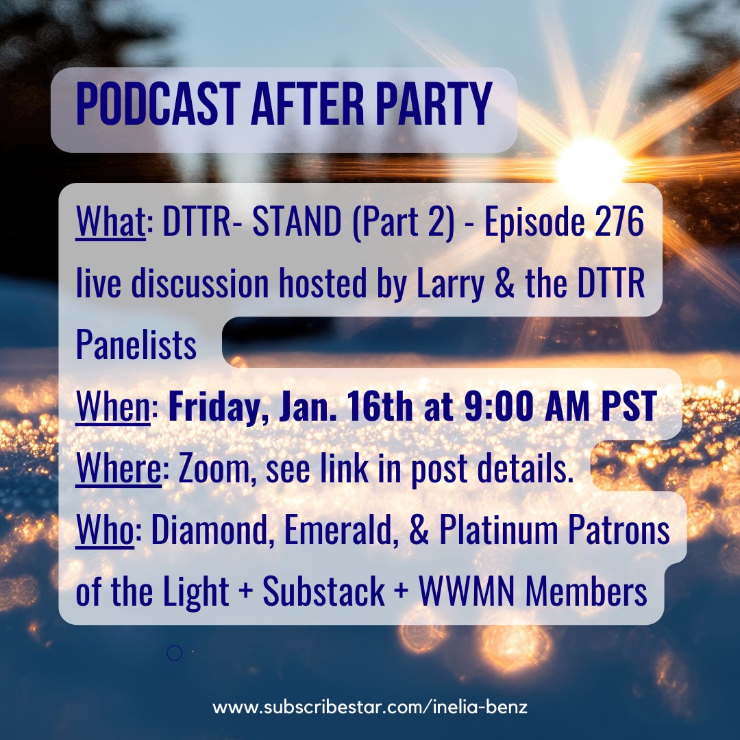 Our next After Party for DTTR this Friday at 9am Pacific. The After Party is available to StartTribe members with the Diamond, Emerald, & Platinum Patron of the Light subscriptions, 2nd Hour Subscribers, and WalkWithMeNow members.